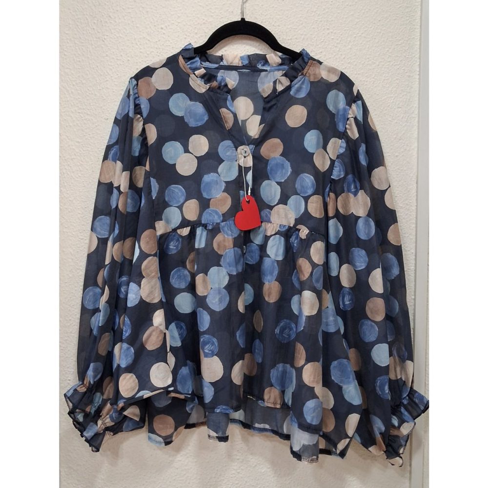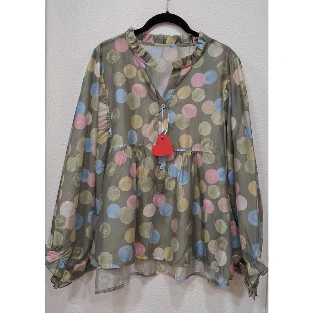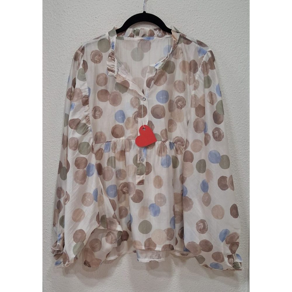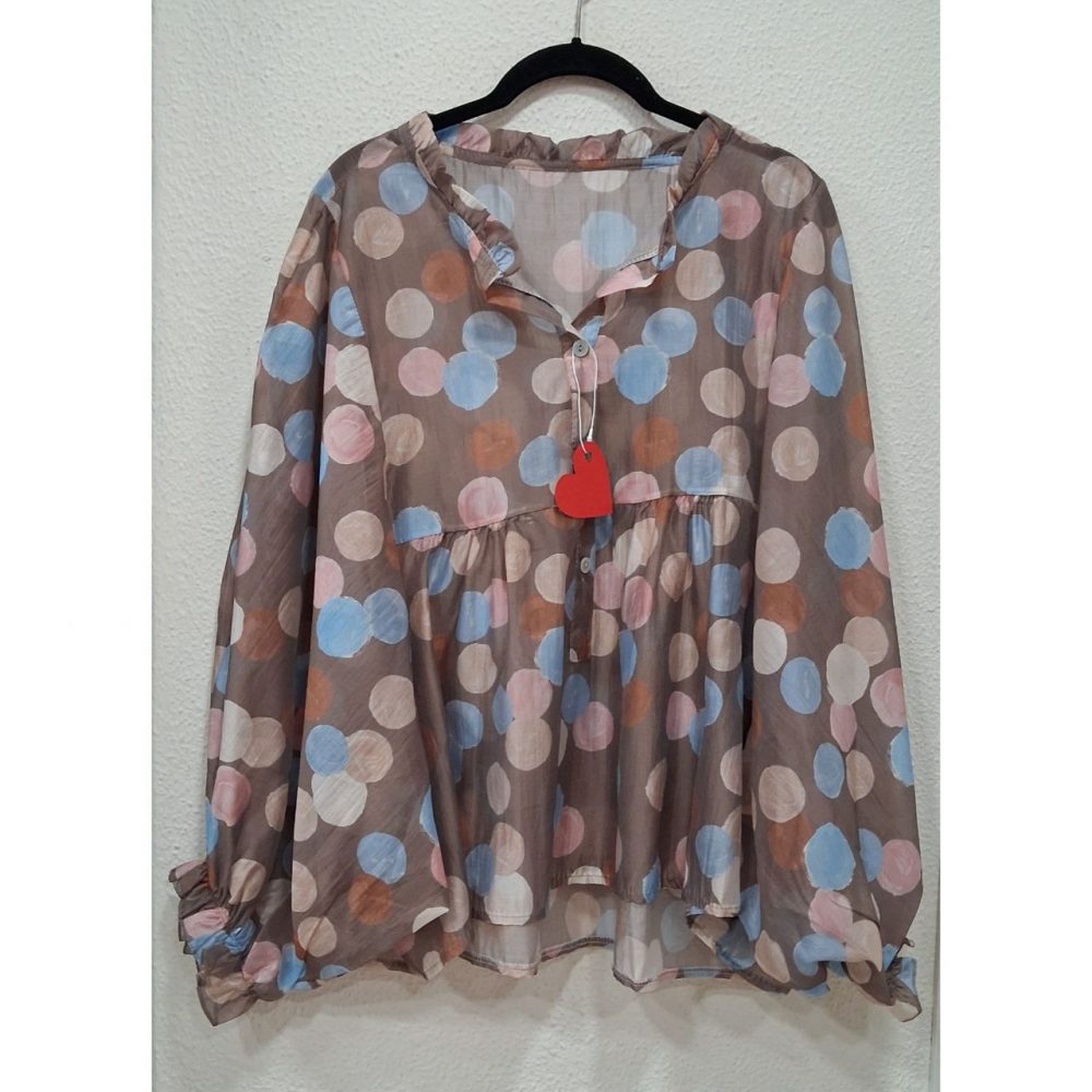 Blusa topos en tejido de tencel 85% y poliester 15%, ligeramente más larga por detrás.