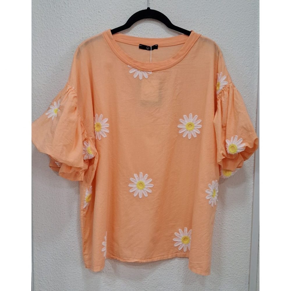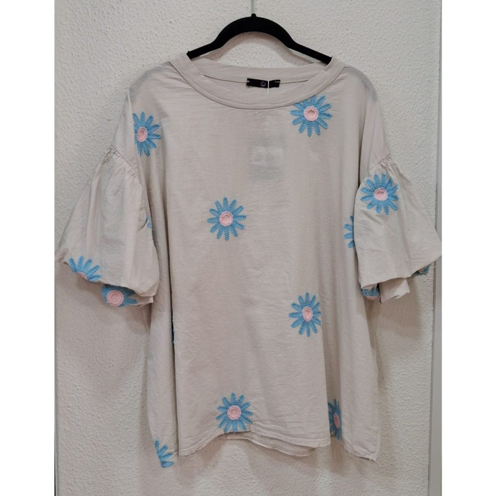 Camiseta flores bordadas, algodón 100%, corte cuadrado