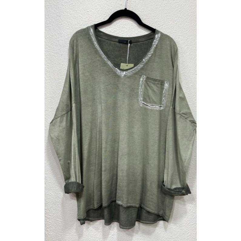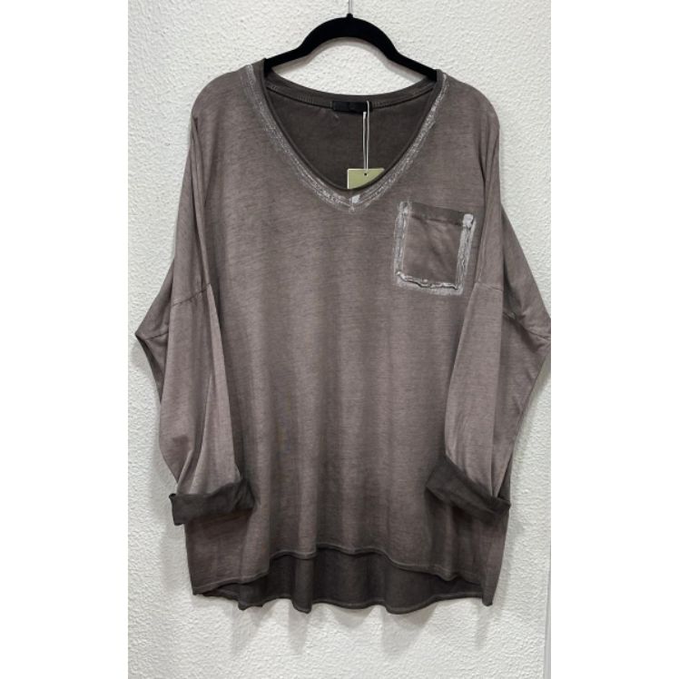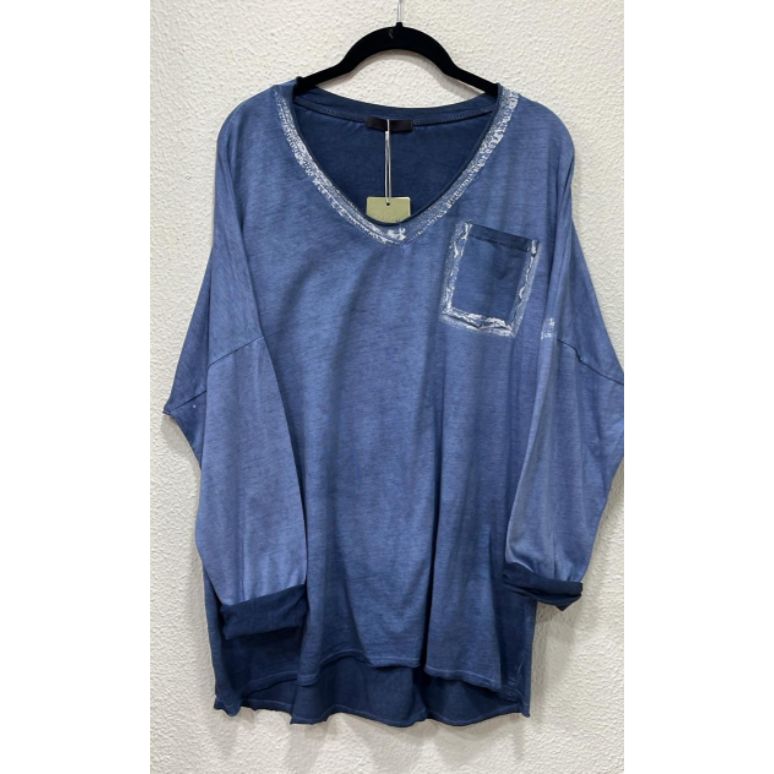 Camiseta pintada en escote pico, algodón 95% y 5% elastano, talla única, medidas: 140 cm contorno de pecho, 120 cm contorno de cadera y 68×76 cm de largo.