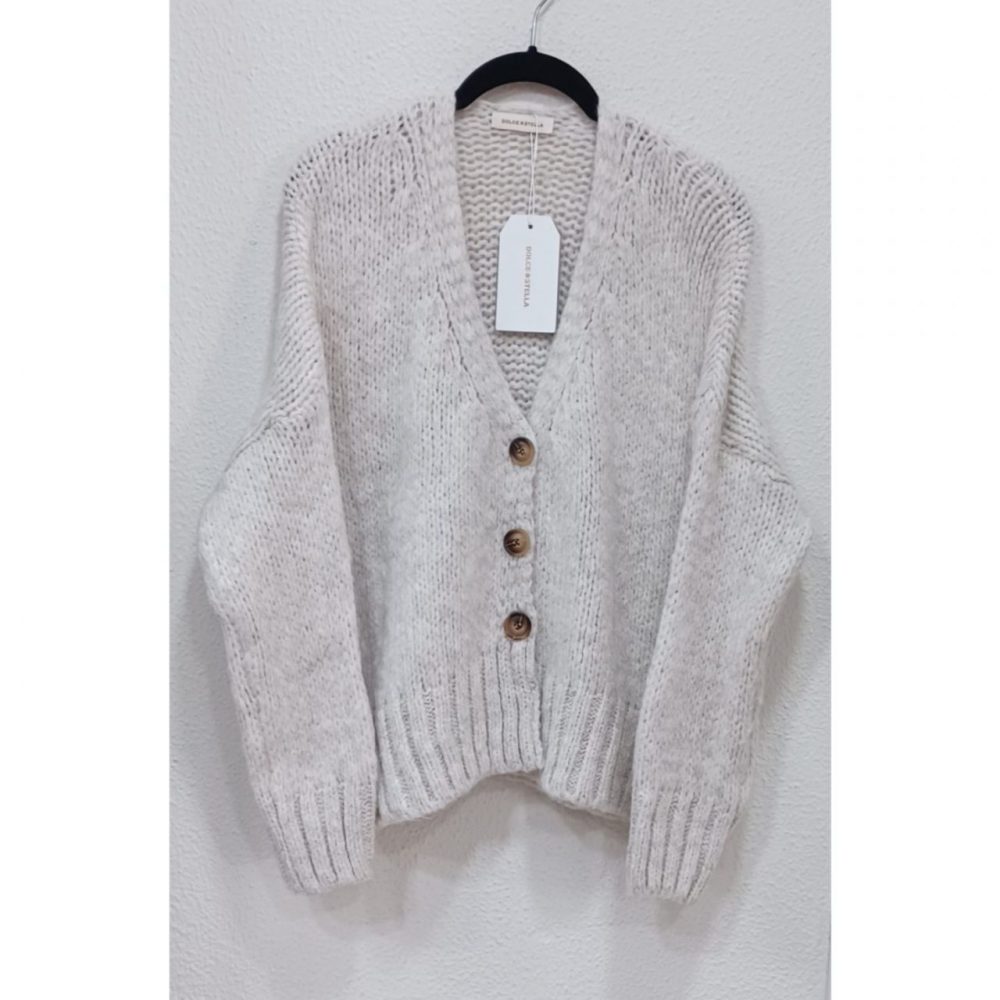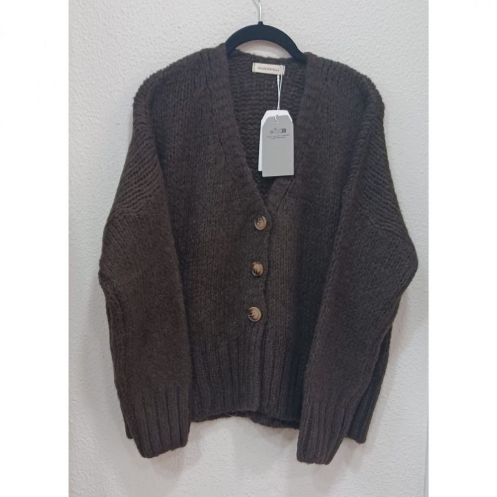 Chaqueta botones, talla única, medidas: 120 cm contorno de pecho y cadera, 62×64 cm largo. 52% acrílico, 22% poliester, 18% lana y 8% viscosa