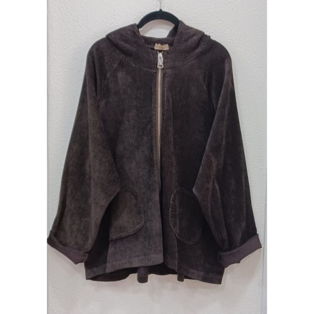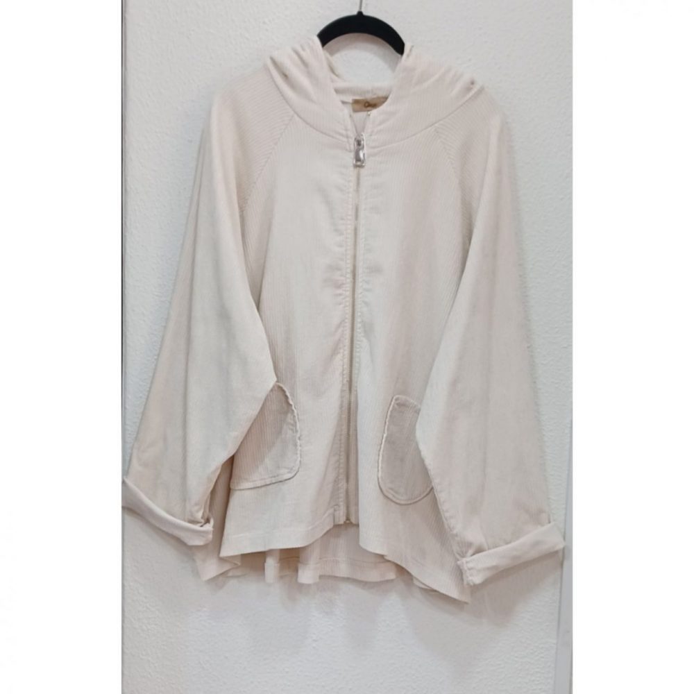 Chaqueta pana con capucha, ligeramente más larga por detrás, talla única, medidas: 140 pecho y cadera, 66×70 largo. Composición: 77% viscosa, 18% poliamida y 5% elastano
