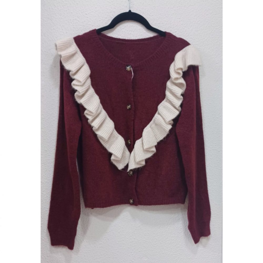 Chaqueta volantes, talla única, medidas: 100 cm contorno de pecho, 88 cm contorno cadera y 54 cm largo. 48% acrílico, 28% poliester, 2% elastano, 6% viscosa, 6% alpaca y 10% lana