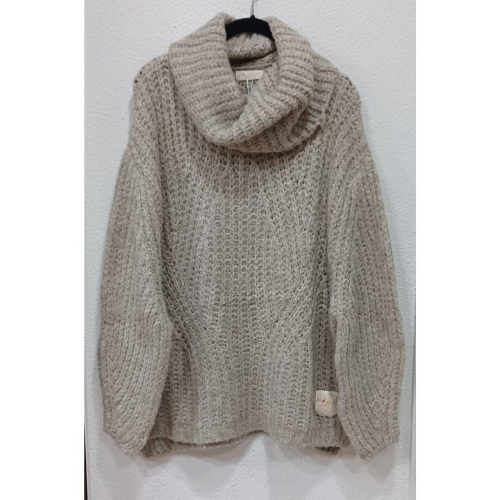 Jersey cuello vuelto, punto grueso, 60% poliacrílico, 12% fibra poliamida, 9% lana, 9% viscosa y 10% mohair, talla única