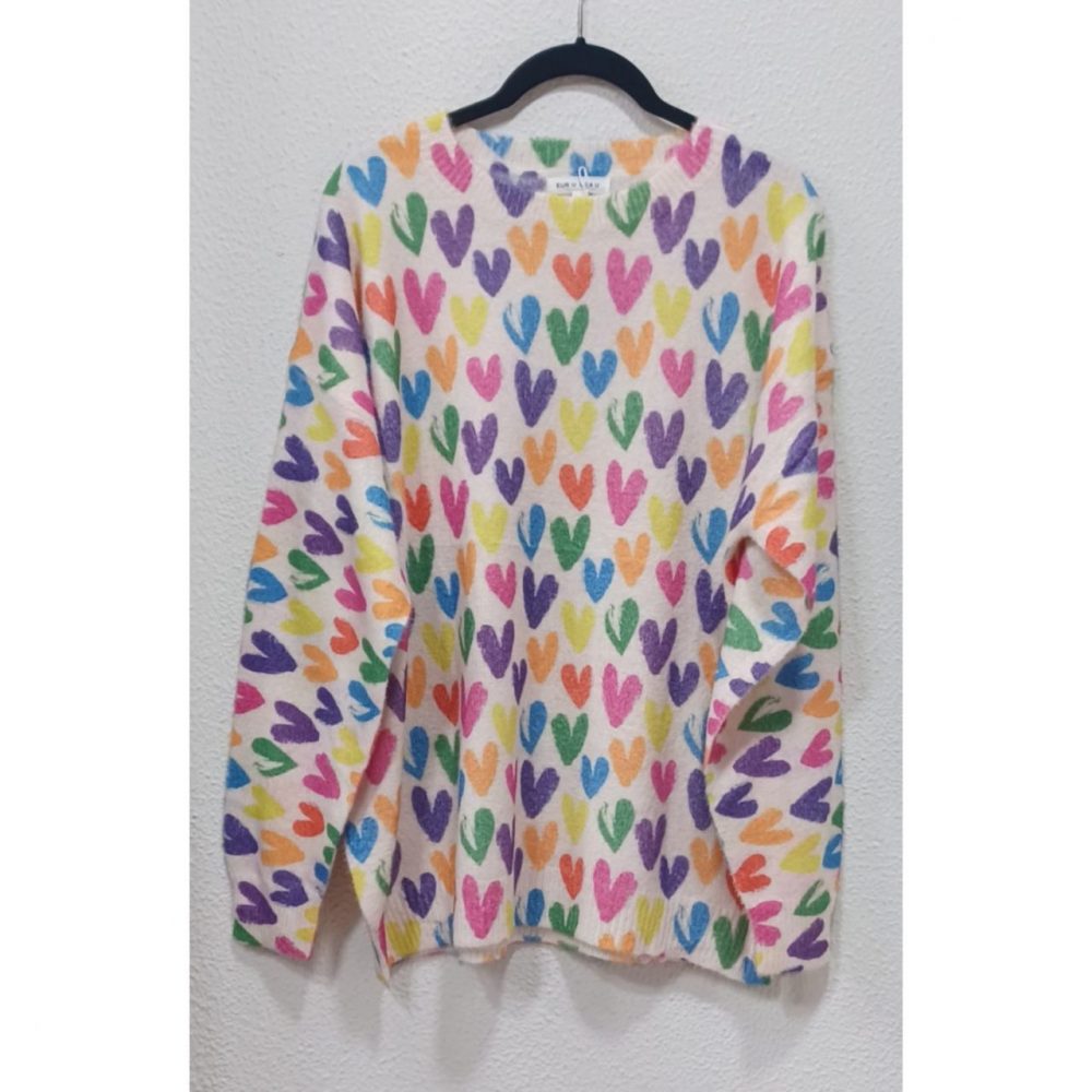 Jersey estampado, talla única, 120 cm contorno de pecho y cadera, 68 cm largo. 65% acrílico, 30% poliester y 5% lana