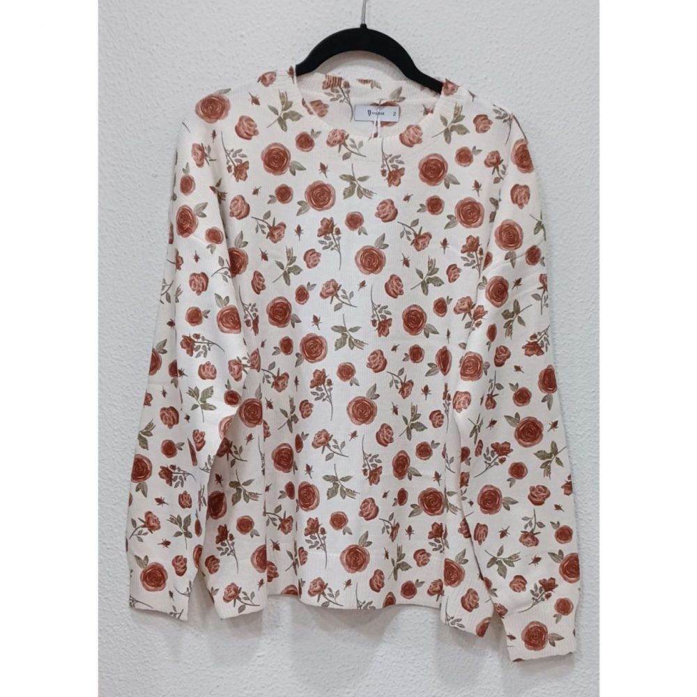 Jersey estampado de punto fino, talla única, medidas: 120 cm pecho, 110 cadera y 61 largo. Composición: 65% viscosa y 35% poliamida